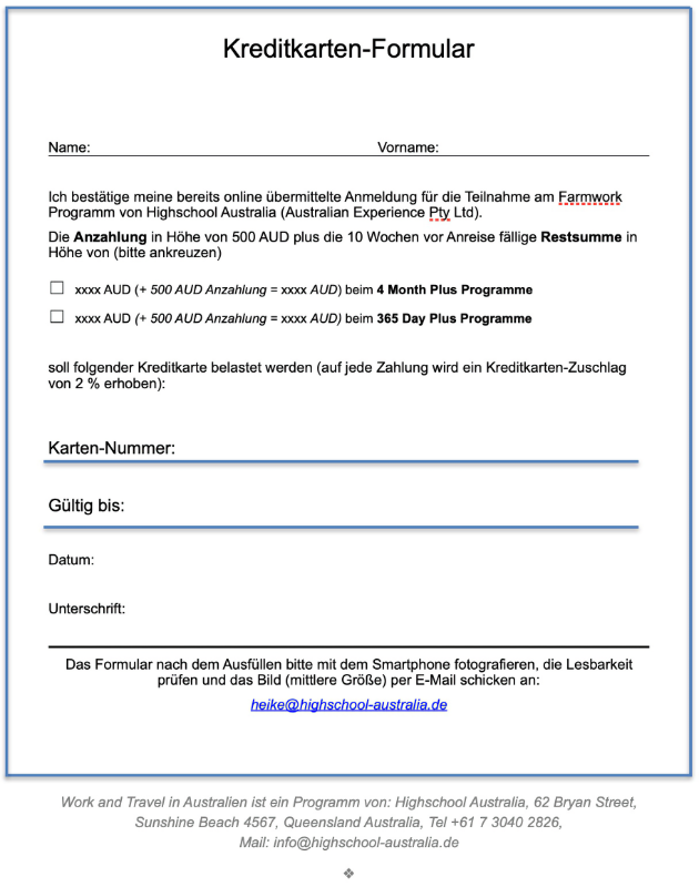 Nachfolgendes Formular bitte downloaden und ausfüllen. Dann mit dem Smartphone fotografieren (bitte Lesbarkeit kontrollieren) und per E-Mail schicken an: heike@highschool-australia.de